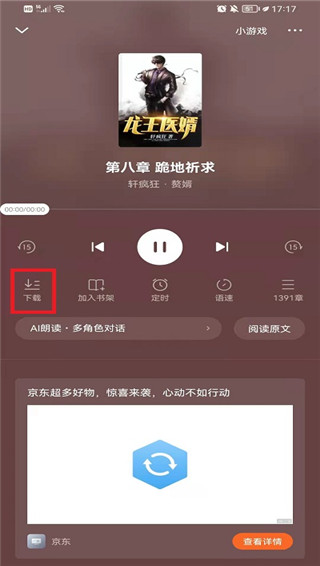 3、点击按钮后就会进入到听书界面,然后用户需要点击界面中的【下载】按钮,然后进行小说语音包的下载。