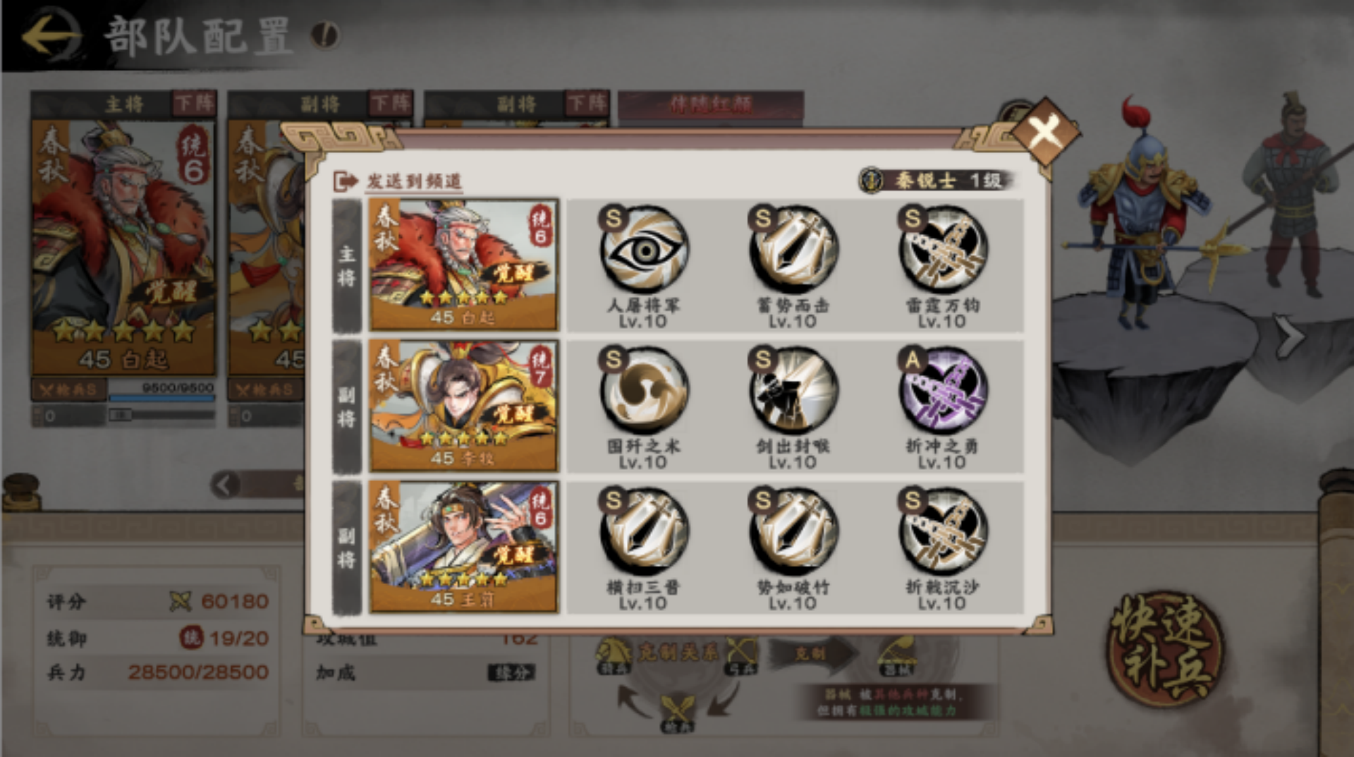 一、最强阵容1、阵容一:白起+李牧+王翦