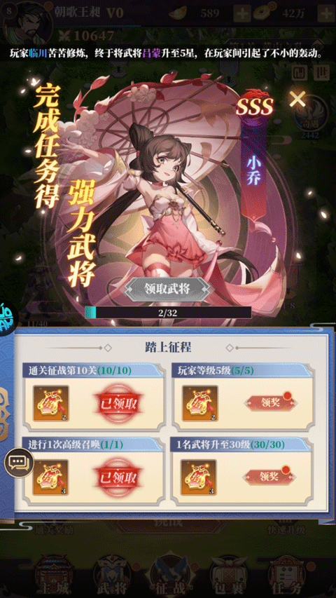 2、完成指定任务即可领取召唤令,任务累积还有机会获得强力将领。