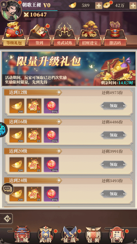 4、限时等级奖励,开服15天内达到指定等级可领取专属奖励。