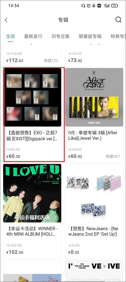 2、通过专辑类别或搜索功能可以寻找到心仪偶像的专辑,点击可进入产品详细展示页。