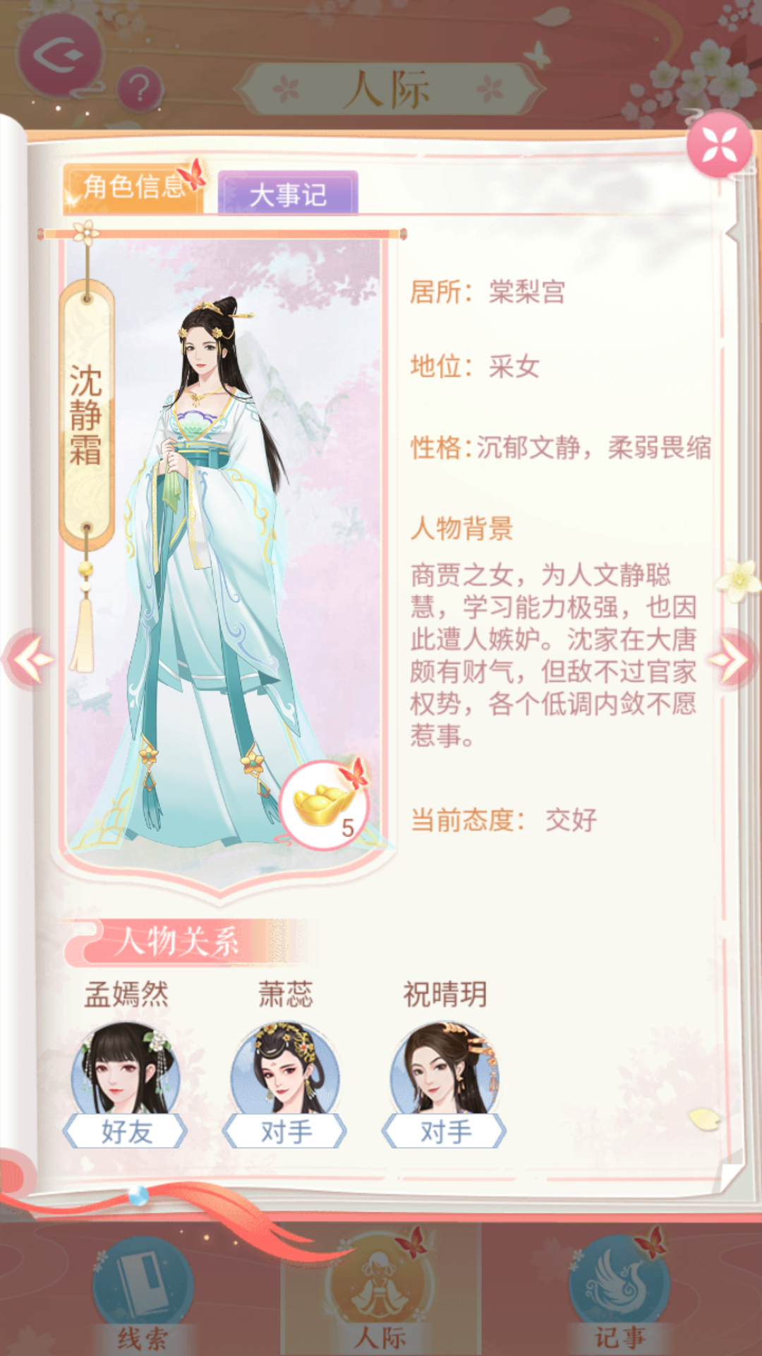4、在人际中点开角色的详情面板可以看到具体信息和对你的态度。