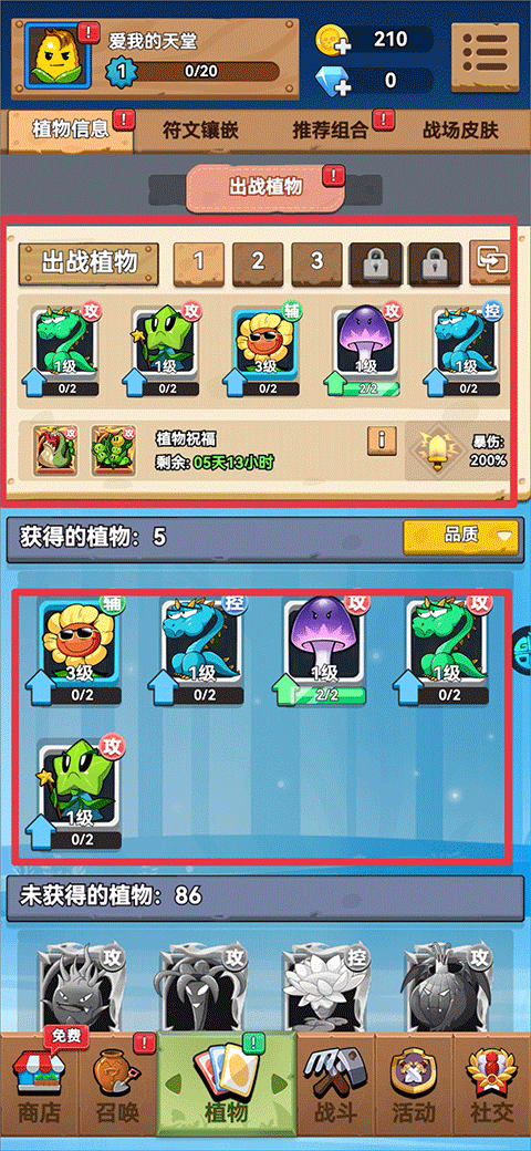 6、玩家可以在植物界面切换和升级上场的植物英雄,提高它们的战斗力。
