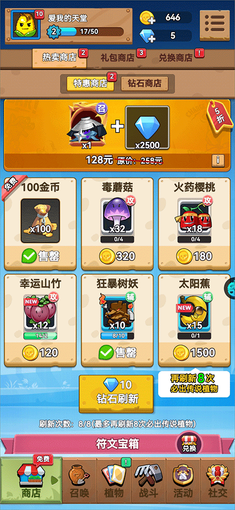 2、商店每日刷新中可能出现传说植物或特价传说箱子,为钻石节约提供了策略。
