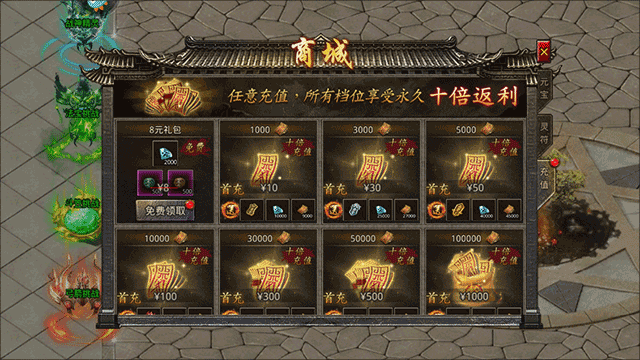 3、开服期间购买特定奖励包获得九龙玉、强化材料和极品时装,特惠购买吸血武器可显著提升属性;