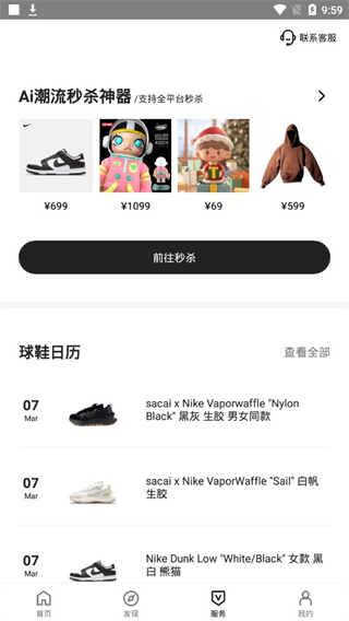 4、服务区展示秒杀产品,用户遇到问题可直接联系客服;