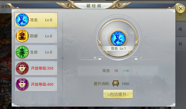 提升人物属性的重要途径。帮派中内容的界面非常简洁,只需要在左边选择需要升级的属性,然后在右边点击提升内功即可。升级所需的帮派贡献可以通过每周重置的帮派任务来获取,一定不要忘记做哦