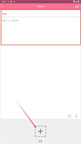 3、最后输入帖子的正文和内容,下方的加号还可以添加图标,点击右上角发表即可。