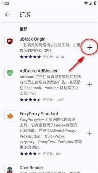3、“扩展”里面就全部是插件了,选择要安装的插件,点击后面的“+”;