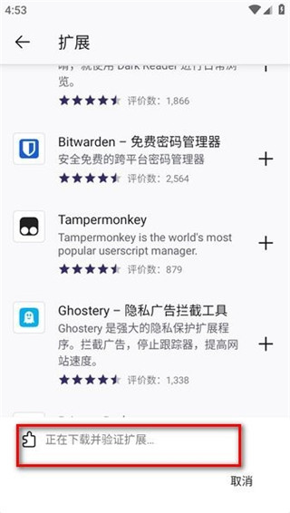4、接着会提示“正在下载并验证扩展”,请耐心等待以后,大概十几秒;