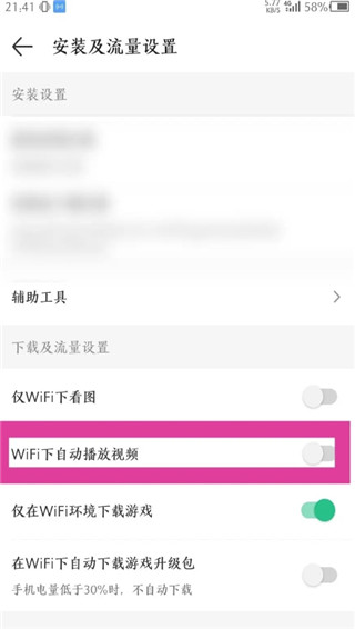 找到WiFi下自动播放视频选项,点击滑块关闭自动播放。