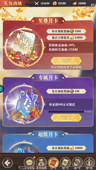 考虑到三卡党的普遍存在,三种卡包(终身、周、月卡)各有其价值,尤其是初期资源的紧缺。
