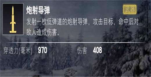 炮射导弹为武器技能,发射一枚低弹道的炮射导弹攻击敌人,穿深970mm,标伤408。低弹道意味着不能隔着掩体进行攻击,对地形要求也很严格。