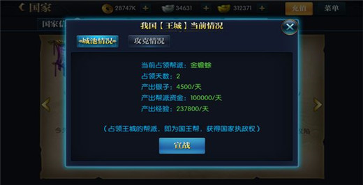 帮主可以选择宣战资金,最终的抢夺资格由竞价资金第一第二获得。除了王城还有其他领地可以供将军选择。