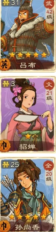 吕布:吕布也是非常适合用来通关沙盘演武的,伤害输出高,适合前期的时候培养。散装宝物搭配最推荐方天画戟+赤兔马,方天画戟能给吕布提升武力和暴击,也可以选择平替的倚天剑,这个也是可以加武力也能提伤害。