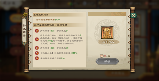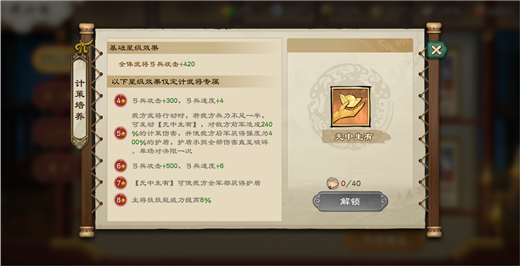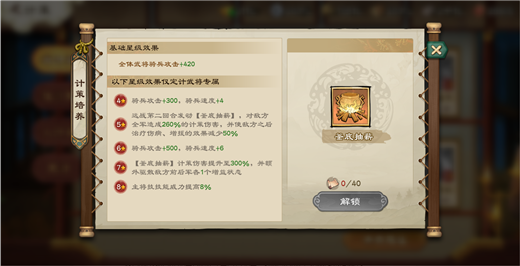 行动时,如果兵力不足1半,对敌人前军造成240%的倍率,并且给一个400%的护盾,7星给全体护盾,但是我们说了,金色计策不用考虑7星,而且,血量越低,伤害是会折损的50%的血量时,伤害也会降低50%,就代表人家输出都打满了,你这个技能才放,伤害不够高,护盾也不够高,还只是纯后军的,应用面太窄了,完全是为了保证远2兵种阶段自己能活下来的一个计策,而且护盾机制S4还会被王越克制,如果不是生存压力实在太大,不考虑,T3