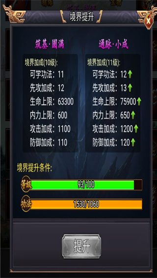 提升人物境界需要“人物等级”和“功法总等级”达到境界需求,比如: