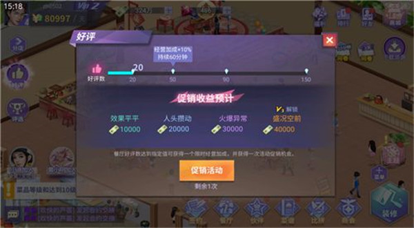 1、好评餐厅食物精美、招待热情,就会收到食客的好评哟,看到他们的点赞了吗?这都是他们的心意,点击就可以收取好评,好评达到一定数量可以为餐厅带来加成增益,且根据好评数量有不同的增益等级,还等什么,大拇指点起来吧!