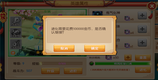 当天赋所消耗的精魄补充满能量条的时候,可通过消耗金币对英雄的星级进行提升,星级越高需要的资源越多,进化后可获得一定属性加成。