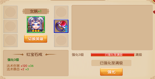 装备分为头饰、胸甲、鞋子、腰带、戒子和项链,去除了繁琐的装备选择,你将不再有选择困难症的烦恼~当到达一定等级的时候,装备还可以进行强化,追求完美的童鞋不妨一试哦~不过需要注意的是,装备强化满后进阶英雄,与不强化直接进阶英雄,属性是一样的。