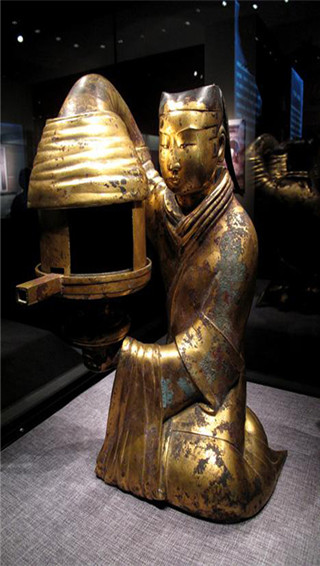 西汉长信宫灯,中国汉代青铜器,1968年于河北省满城县(今河北省保定市满城县西南约1.5公里的山崖上)中山靖王刘胜妻窦绾[wǎn]墓中出土。2010年作为中国2010年上海世界博览会展品展出。宫灯灯体为一通体鎏金、双手执灯跽坐的宫女,神态恬静优雅。灯体通高48厘米,重15.85公斤。长信宫灯设计十分巧妙,宫女一手执灯,另一手袖似在挡风,实为虹管,用以吸收油烟,既防止了空气污染,又有审美价值。此宫灯因曾放置于窦太后(刘胜祖母)的长信宫内而得名,现藏河北省博物馆。