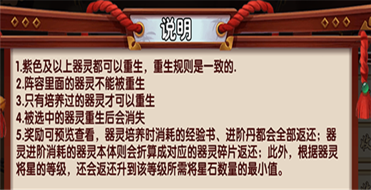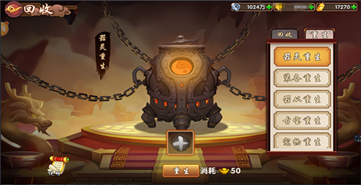 玩家中前期在获得的多余的资源,在回收功能开启后进行回收处理。回收会以各类的资源货币进行存储,玩家可以使用资源货币进行购买其他自己需要的资源。已经培养过的装备、器灵、古宝、器从、宠物都可以进行重生,需花费50元宝,培养所使用的资源也都会全额返还。