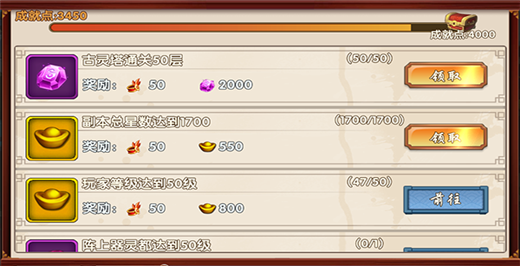 成就任务主要用来记录玩家成长的过程,玩家可以查看自己的成就,来回味自己在游戏中付出的辛勤劳作,同时这也是一个小小的福利系统,当玩家成就点数到达一定数值后,还可以获得额外的元宝奖励。成就系统中的任务,达成的难度高于日常任务,例如:玩家等级达到20级,上阵武将都达到20级,副本总星数达到200等。