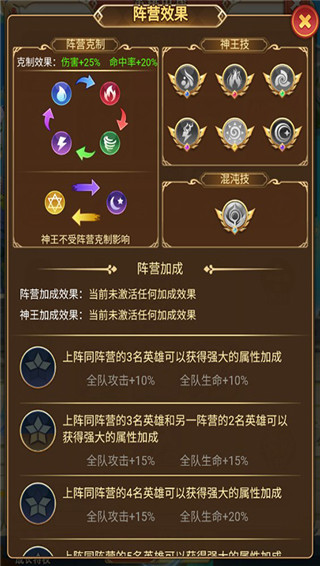 6、英雄之间还存在阵营效果,包括克制和加成,玩家可以根据阵营效果进行英雄阵容搭配。