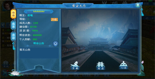5、加入帮会后点击帮会进入到帮会大厅界面,帮会大厅分信息、成员、活动分页