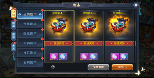 材料副本为单人副本,主要提供坐骑进阶与培养、装备升星、装备强化、仙器进阶与培养、神兵升星、羽翼进阶与培养功能需要材料的获取途径。玩家在成功首通了材料副本后每日可以对材料副本进行扫荡获取提升材料。未成功通关材料副本不扣除副本次数;
