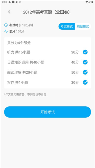 3、选择一份你需要练习的试卷,点击开始考试