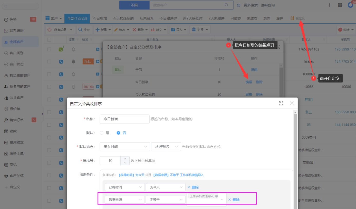 比如,【今日新增】的客户包含了从工作手机自动录入的微信客户,如何能还是像之前一样,只显示今天录进来的客户呢?【就是不要显示从工作手机进来的微信客户。】