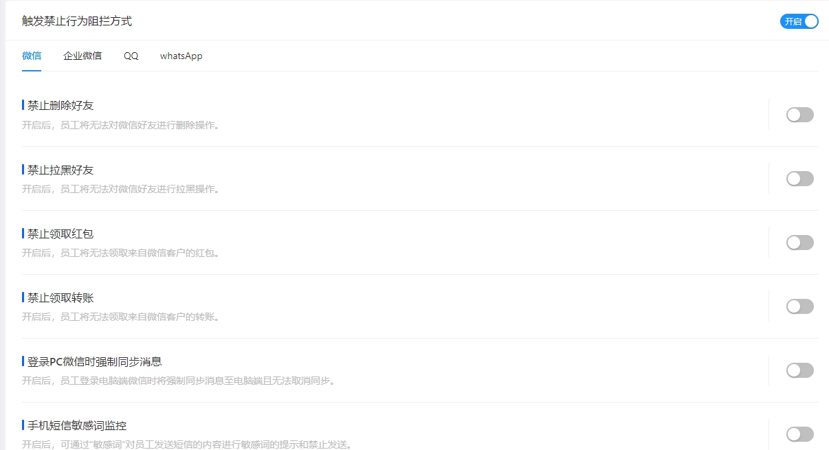 答:可以的。禁止删除微信好友,禁止删除微信消息等都可以调整。除此之外,还有很多其他的禁止设置项目,如下图: