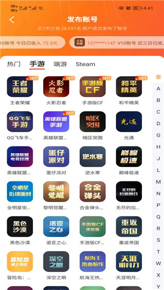 1、自主研发的登号器,解决了玩家租号上号过程复杂的操作,一键快捷登录,加密安全,买卖无忧。2、王者荣耀、手游CF枪战王者、英雄联盟LOL、QQ飞车、球球大作战等热门游戏高段位,绚装备、多皮肤、V8大神账号租号体验。
