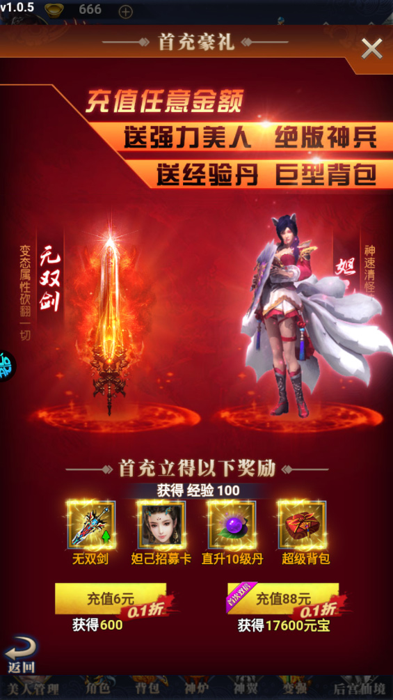 1、0.1折首充豪礼玩家点击游戏上方的首充,即可进入首充页面,只需0.01元即可获得首充大礼包,内含80级武器等装备道具。