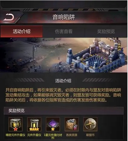 音响陷阱由盟主或官员手动开启。开启后,会引来毁灭者,必须在30分钟内与盟友对音响陷阱发动集结攻击。如果成功消灭,则盟友皆可获得奖励。消灭之后可以继续攻打,按照伤害计算会获得更多奖励