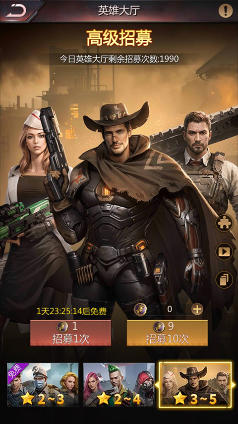 5、通过消耗招募币在游戏大厅进行英雄招募,包括23星、24星、3~5星三种不同级别的英雄卡池,高星级英雄具有更优秀的品质,玩家可通过消耗招募币抽取。