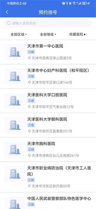 2、即可出现天津市区的所有医院,根据所需选择医院