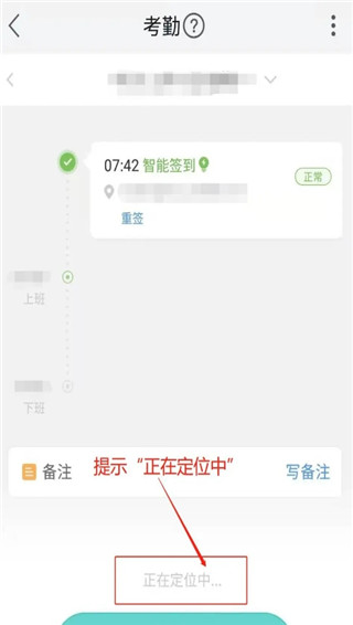 跳转至“考勤”界面,“签退”字样上方提示“正在定位中...”,等待定位;