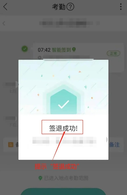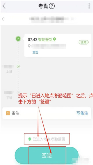 待提示变为“已进入地点考勤范围”之后,点击下方的“签退”;