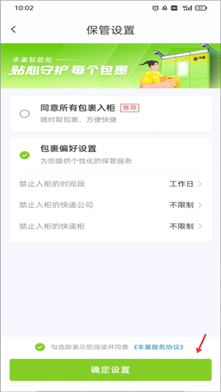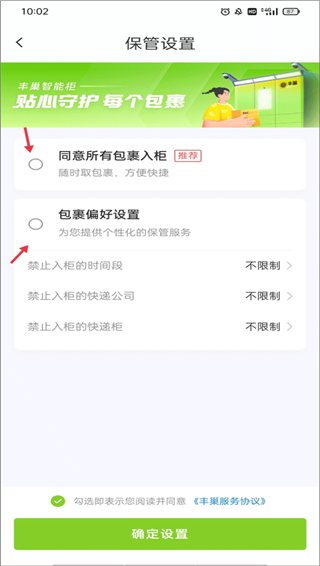 3、你可以在包裹偏好设置中勾选你要禁止入柜的时间段、快递公司、快递柜等,最后勾选《服务协议》,点击“确定设置”就好了。