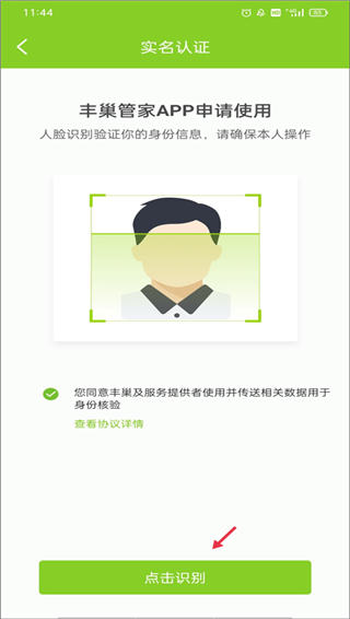 (4)勾选下方的“您同意丰巢及服务提供者使用……”,点击识别开始人脸识别,识别成功后就表示已经认证成功了。