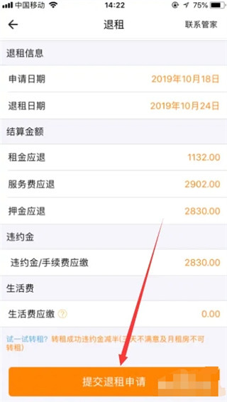 然后就可以看到具体的结算金额,违约金等,点击“提交退租申请”即可。