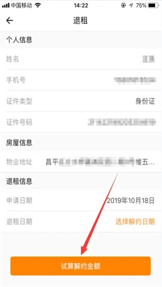 进入退租页面后,先填写退租日期,然后点击下面的“试算解约金额”。