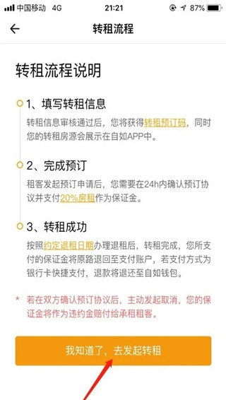 然后就会进入转租流程,确认无误之后,点击下面的“我知道了,去发起转租”,如图所示。