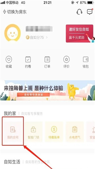 进入自如个人中心之后,选择其中的“我的合同”,如图所示。