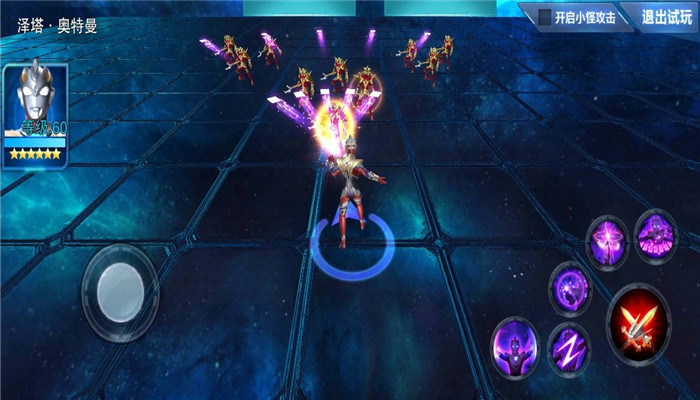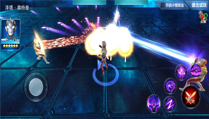 3、伽马幻象:冻结范围内敌人,借用前辈的力量,召唤迪迦、戴拿、盖亚的幻影对目标进行光线合击。