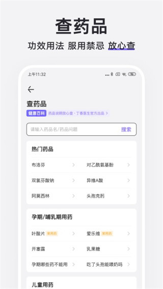 1.「搜索功能」杜绝医疗广告,提供可信赖的疾病、药品、医院查询;2.「用药咨询」面对如何用药的困扰,条码一扫,免费咨询药师;