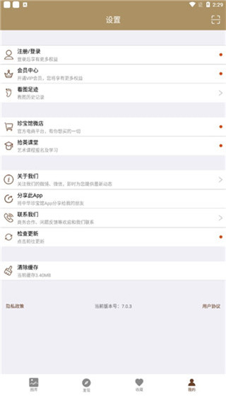中华珍宝馆app最新版本中还有商城服务板块,在商城中有这个各种好物精品,其中有字画,毛笔,茶具等,点击进去即可查看商品的详细信息,购买后会在最短时间内为你送货上门,同时这些商品的价格非常实惠,你可以以最低的价格买到品质最好的产品。有需要的朋友快来下载软件享受字画吧。