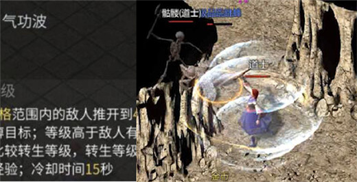 气功波:聚集体内真气,然后向四周猛烈释放,把身边所有敌人震开并麻痹。与法师的抗拒火环类似,是道士珍贵的保命技能,在PK中把握好使用的时机,方能化险为夷。